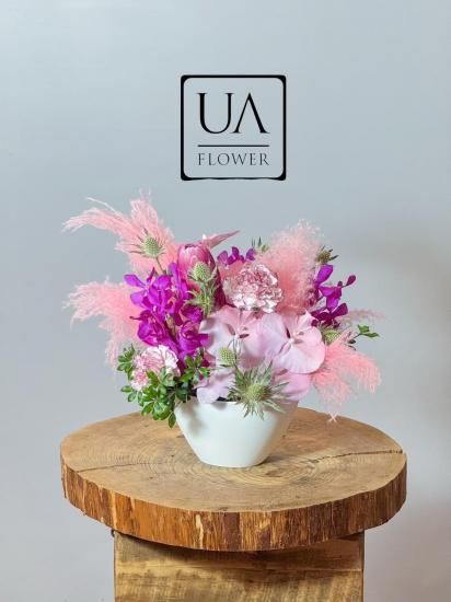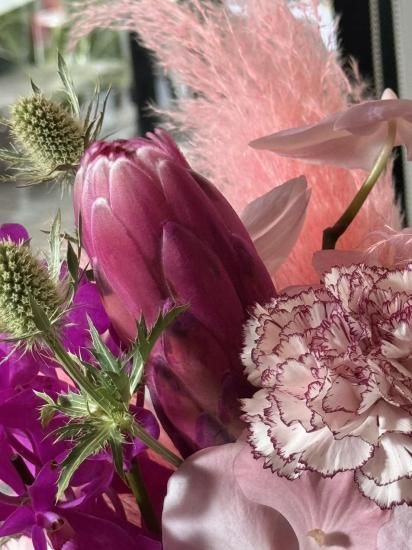 フワフワピンクなフラワーアレンジメントは、お部屋にほんのりとした幸せの香りを運んできます。ふんわりと広がる優しい香りに包まれながら、リラックスした時間を過ごすことができるでしょう。ぜひ、心を豊かにしてくれるこの素敵な一品をお楽しみください。