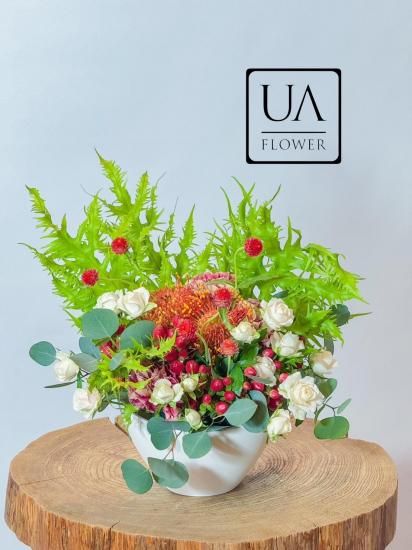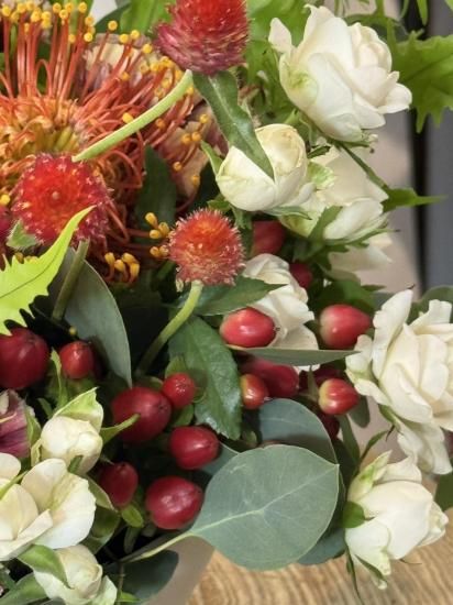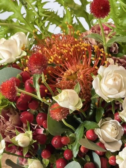 赤系の華やかな花々が美しくアレンジされたフラワーアレンジメントで、特別な日のお祝いを素敵に彩りましょう。還暦祝いに相応しい華やかさとオシャレさを兼ね備えた商品です。福岡の花屋が丹精こめて仕上げた本商品は、花材の鮮度と品質にこだわり、お祝いの気持ちを豊かに表現します。