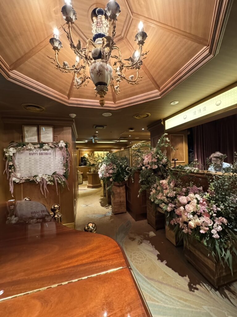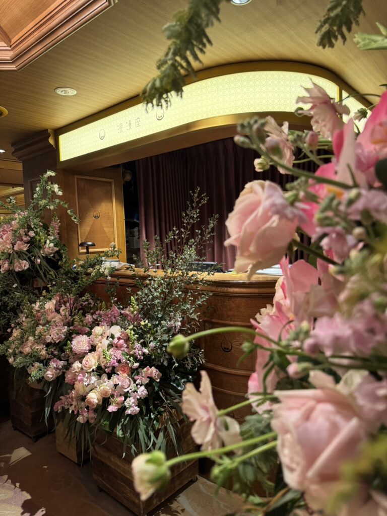 主役となる大きなアレンジメントには蘭やバラ、季節の花々を贅沢に使用し、