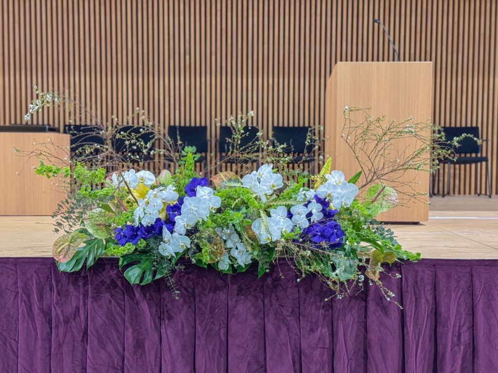 今回のような式典では、これらすべてが揃って初めて「オシャレで印象に残るステージ装花」になります。