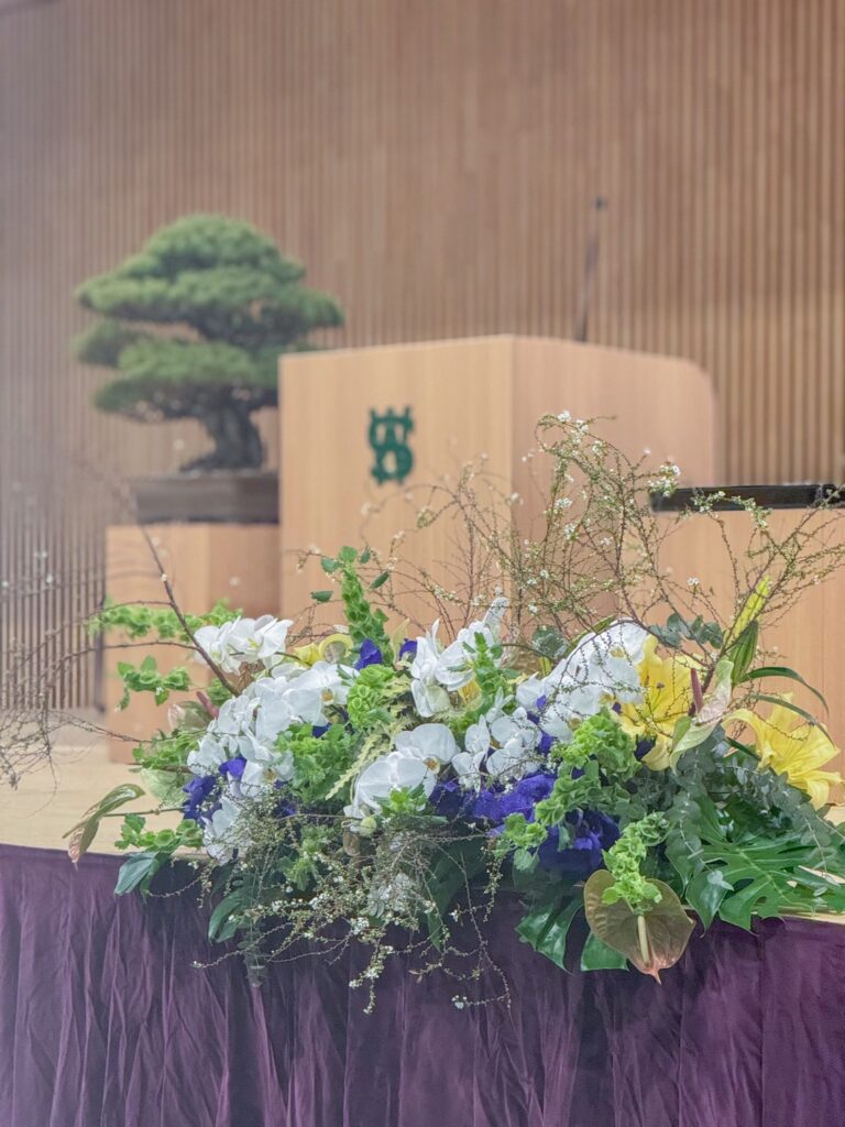 本記事では、福岡の花屋として手がけた今回のステージ装花について、デザインのこだわりやポイント、そして式典装花を検討されている企業・学校関係者様に向けたヒントをご紹介いたします。